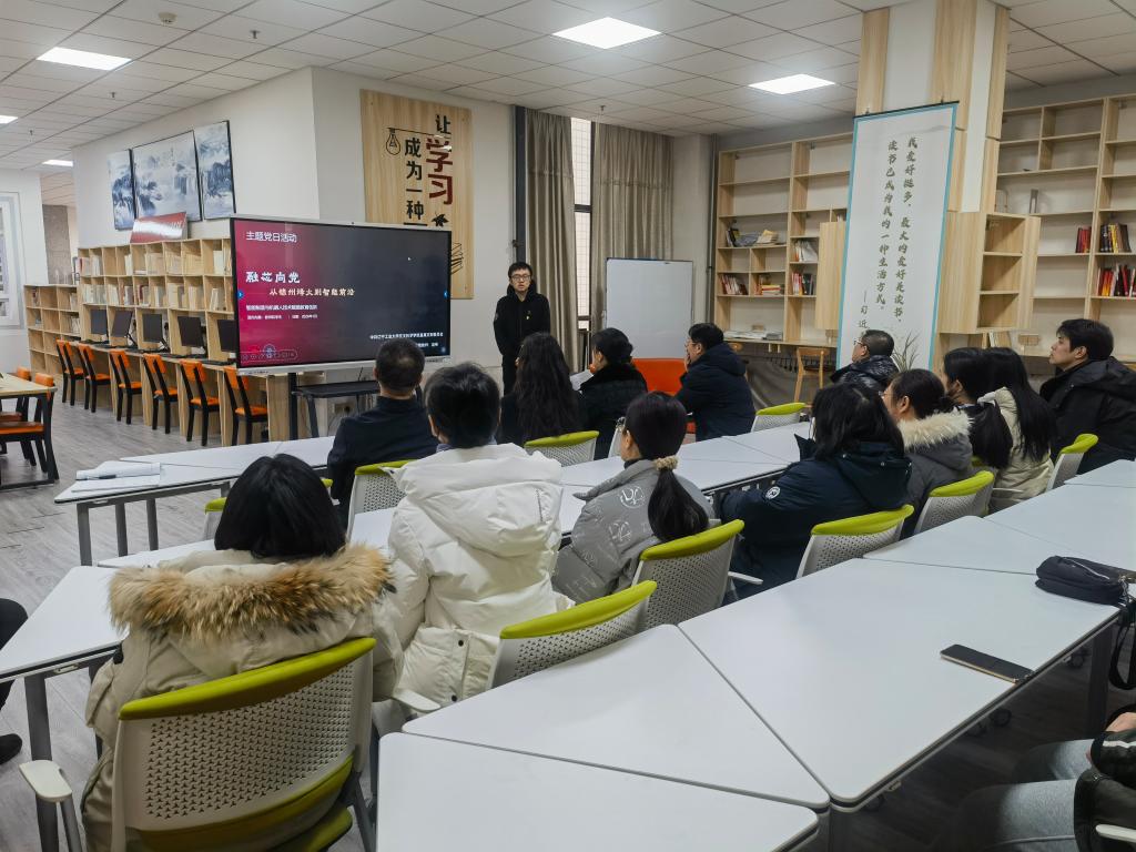 活动中,全体党员参观了学校图书馆红色文化书屋,并认真听取了专题讲解。交叉科学学院教师党员赵彬以“融芯向党——从锦州烽火到智能前沿”为题作专题报告。他立足学校建立在辽沈战役配水池战斗遗址之上的红色根脉,鼓励教师们在教育教学中要以“红色引擎”驱动“蓝色创新”,通过掌握人工智能、大数据等前沿技术发展趋势,提升跨学科教学能力,培养具有家国情怀和工匠精神的新时代“红色工程师”。